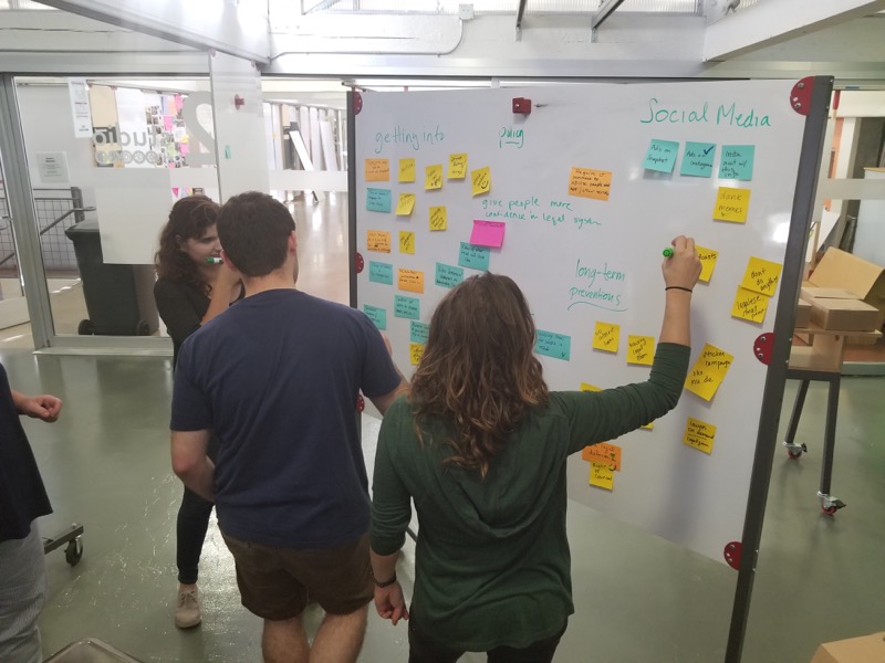 Daniel prepared 4 different use cases and user personas, that grounded each of the design teams in a particular situation. We formed teams of 4-5 people around different use cases, and led the teams through brainstorming, prioritization, and prototyping of new concepts. Among the ideas: a mobile eviction help van with lawyers, a conversational app that would help direct people to the right, streamlined content to focus on, and a Khan-Academy-like training for people who want to defend themselves from eviction.