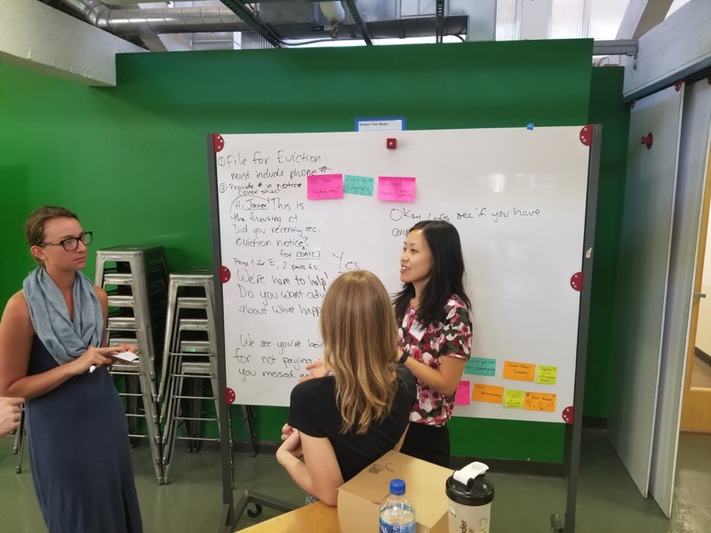 Daniel prepared 4 different use cases and user personas, that grounded each of the design teams in a particular situation. We formed teams of 4-5 people around different use cases, and led the teams through brainstorming, prioritization, and prototyping of new concepts. Among the ideas: a mobile eviction help van with lawyers, a conversational app that would help direct people to the right, streamlined content to focus on, and a Khan-Academy-like training for people who want to defend themselves from eviction.
