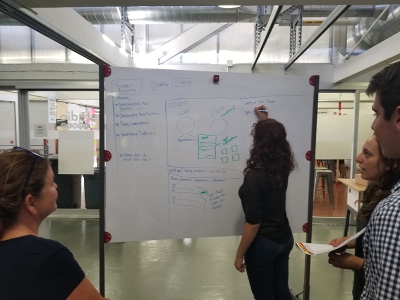 Daniel prepared 4 different use cases and user personas, that grounded each of the design teams in a particular situation. We formed teams of 4-5 people around different use cases, and led the teams through brainstorming, prioritization, and prototyping of new concepts. Among the ideas: a mobile eviction help van with lawyers, a conversational app that would help direct people to the right, streamlined content to focus on, and a Khan-Academy-like training for people who want to defend themselves from eviction.