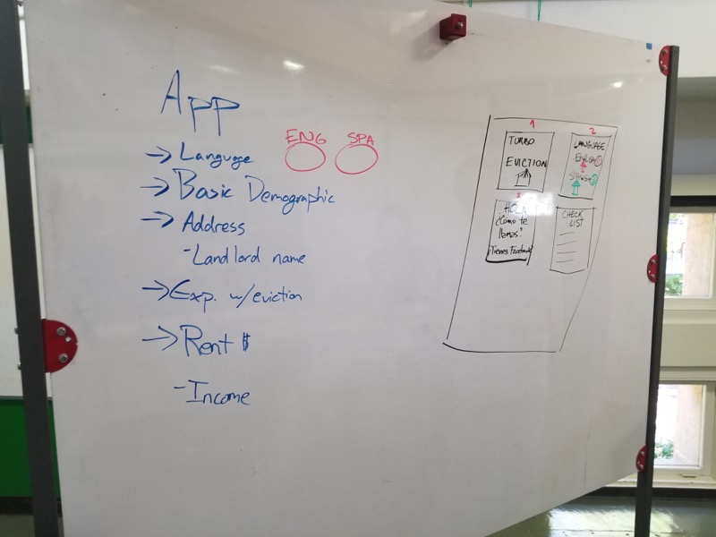 Daniel prepared 4 different use cases and user personas, that grounded each of the design teams in a particular situation. We formed teams of 4-5 people around different use cases, and led the teams through brainstorming, prioritization, and prototyping of new concepts. Among the ideas: a mobile eviction help van with lawyers, a conversational app that would help direct people to the right, streamlined content to focus on, and a Khan-Academy-like training for people who want to defend themselves from eviction.