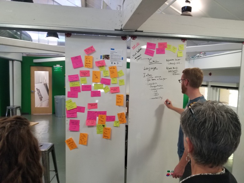 Daniel prepared 4 different use cases and user personas, that grounded each of the design teams in a particular situation. We formed teams of 4-5 people around different use cases, and led the teams through brainstorming, prioritization, and prototyping of new concepts. Among the ideas: a mobile eviction help van with lawyers, a conversational app that would help direct people to the right, streamlined content to focus on, and a Khan-Academy-like training for people who want to defend themselves from eviction.
