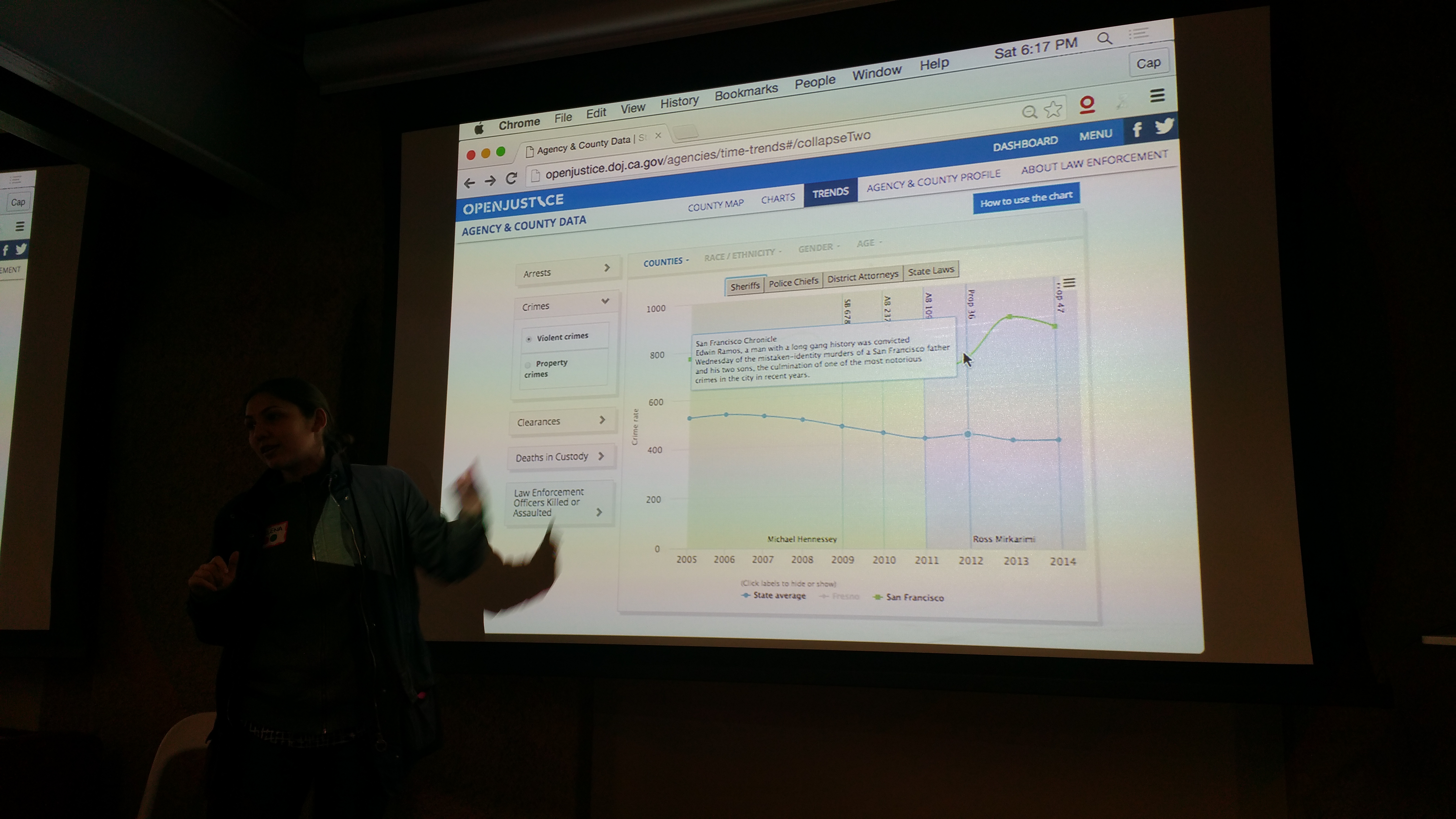 2. Making Criminal Justice Data come alive: How can we make all the data that the DOJ gathers about the justice system in California be more useful and engaging? Are there other displays, data sets, interactive features, or beyond that could make this data more meaningful? The target users here are researchers, journalists, policy-makers, and engaged citizens who want to understand the realities of how the justice system is operating, and to figure out better ways to intervene and improve it. (As well as, even, what better questions we can be asking about the system — where to be looking to find sparks for new solutions).