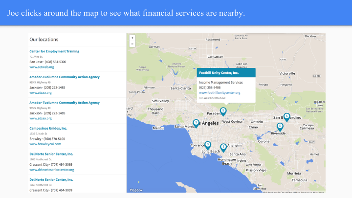 Re-entry Assistance is a web app that helps a person who’s come out of prison/jail to go to a centralized site, see the menu of services that they might need (legal, disability, medical, social, mental health, etc.) and a map of local service-providers they could connect with.