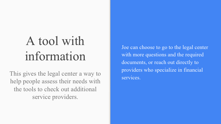 The goal here is not to eliminate the lawyer step — the group knew from experience that people need the conversation and lawyer’s perspective. But it’s to streamline intake, structure the lawyer’s thinking and conversation, and to automate/easily populate the forms to save the lawyer time.