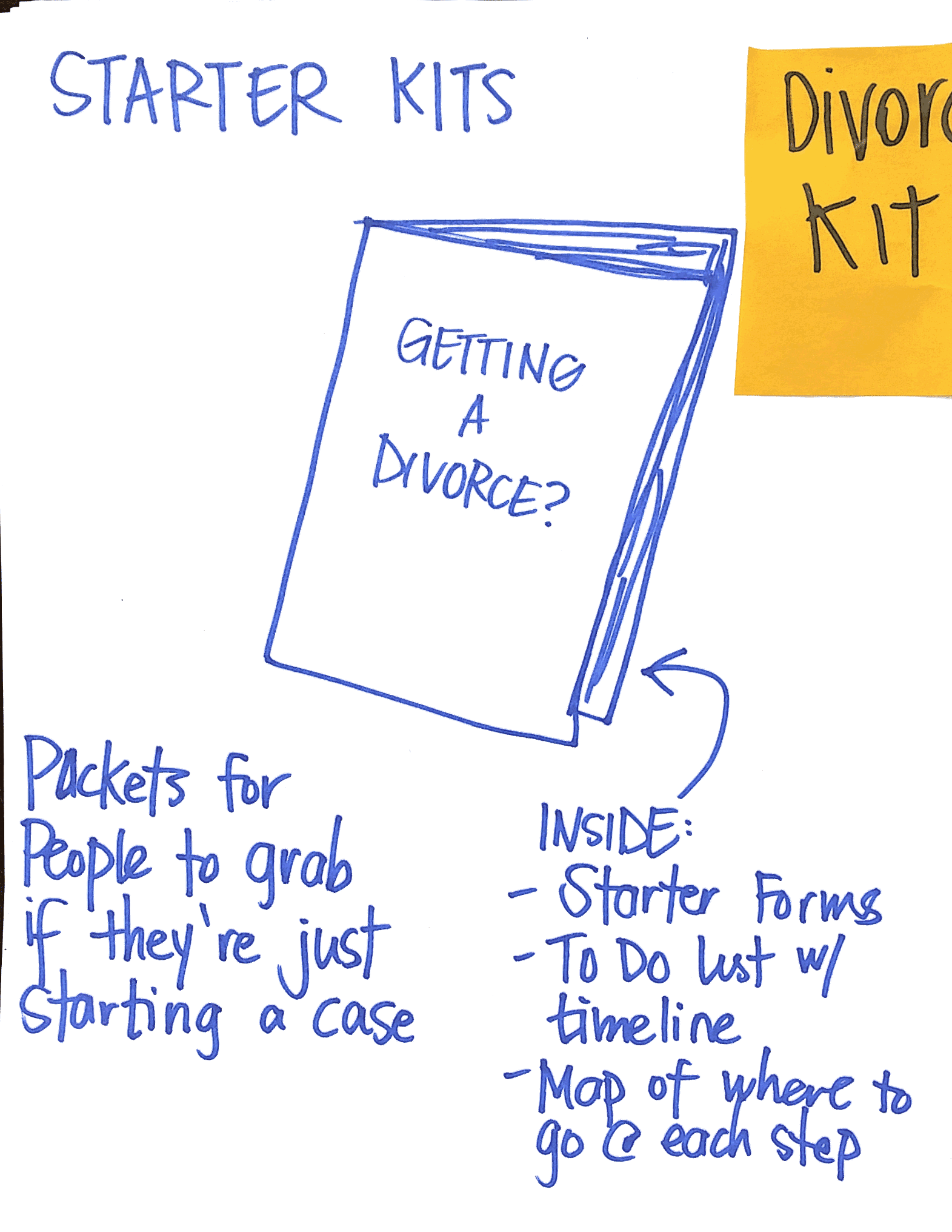 Many of the ideas are very sketchy, without much detail or thought about implementation. But this large collection of concepts helped us to have a very productive brainstorm, and gave us a lot of material with which to pattern and then prioritize the concepts we felt were most promising take forward. We also used many of these early concepts as sacrificial prototypes/provocations, that we could show to our users or to court staff, and get their feedback as well as their additional ideas.