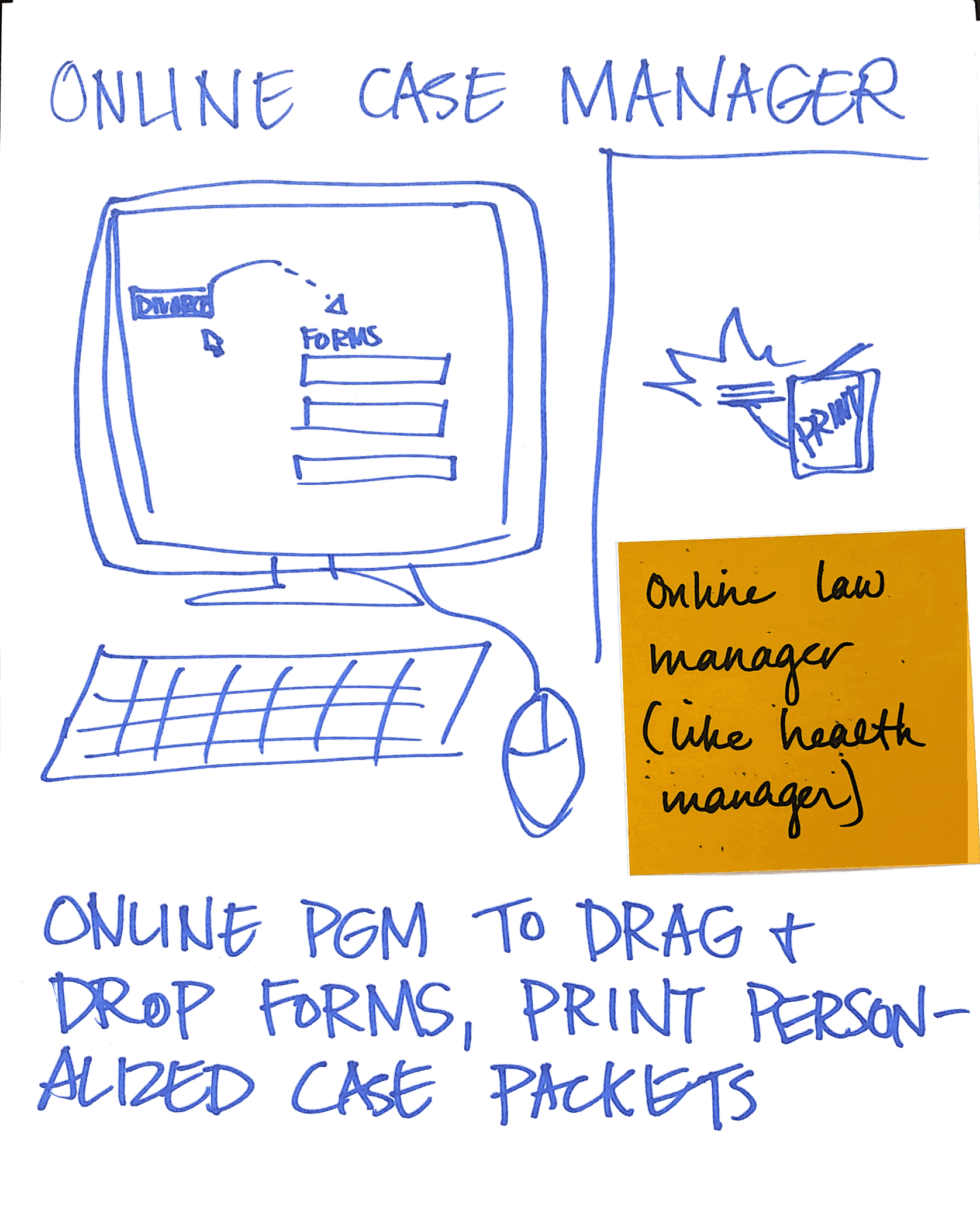 Many of the ideas are very sketchy, without much detail or thought about implementation. But this large collection of concepts helped us to have a very productive brainstorm, and gave us a lot of material with which to pattern and then prioritize the concepts we felt were most promising take forward. We also used many of these early concepts as sacrificial prototypes/provocations, that we could show to our users or to court staff, and get their feedback as well as their additional ideas.
