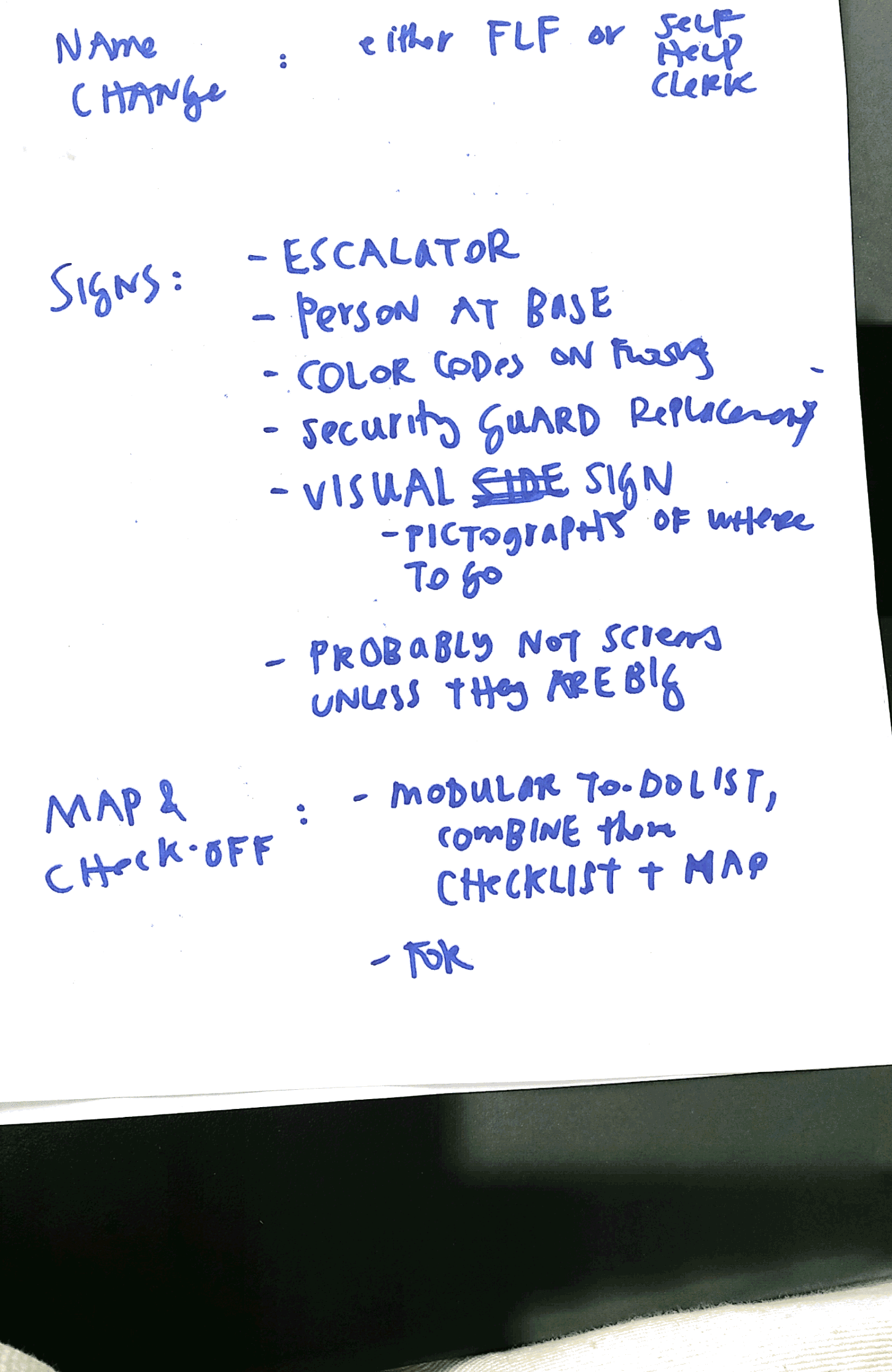 As soon as we began this design cycle, we took note of any ideas that we had. Even though there is a designated part our work cycle in which we would do brainstorming, we acknowledge that good ideas pop up even when we are supposedly focused on other things, like observing the space or doing interviews. Anytime an idea was suggested to us or something triggered an idea in us, we jotted it down, and then did regular debriefs as a team to share these ideas.