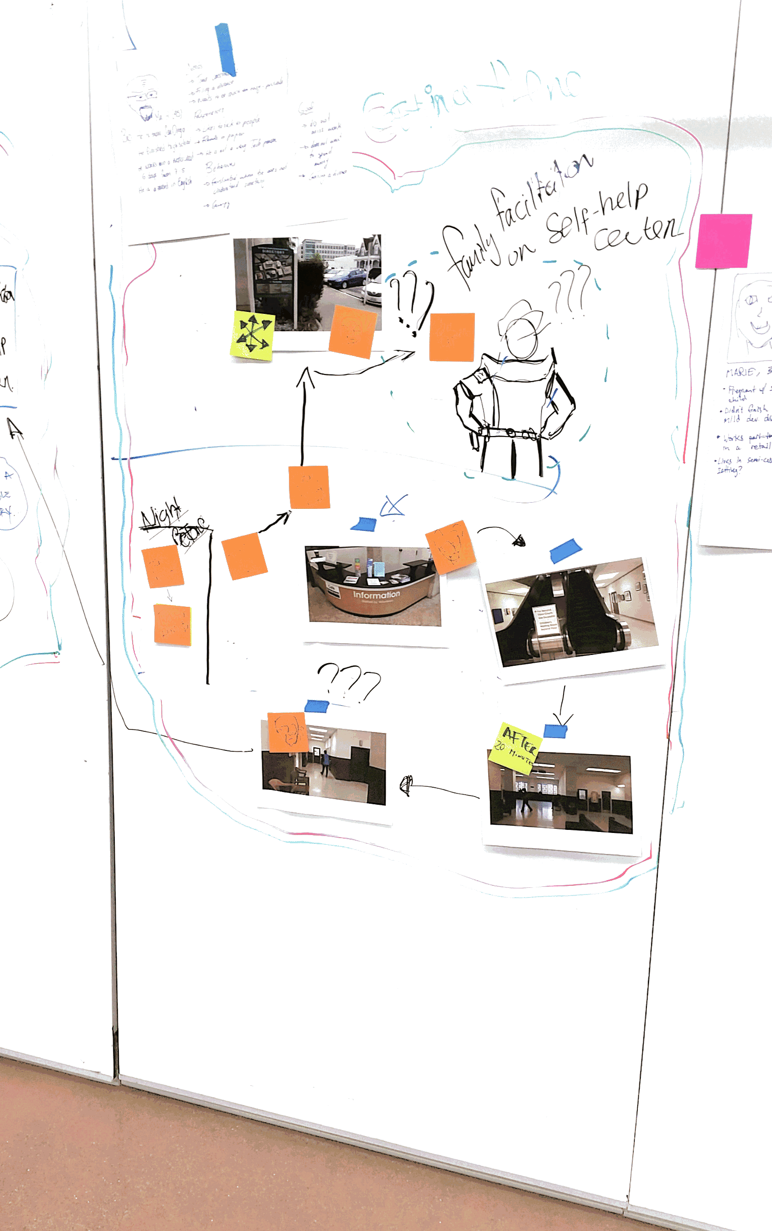 We had three sessions in the court building and the self-help center to uncover problem areas, successes, and other needs and requirements for the people seeking out help for family law problems. During the sessions, we used a range of design research methods to understand the current Service design and user experience. These methods included observation, service safaris, interviews with users, interviews with staff and other professionals, and feedback sessions on sacrificial ideas. Using these methods, we were able to figure out more precisely how we could improve the user experience of the courts