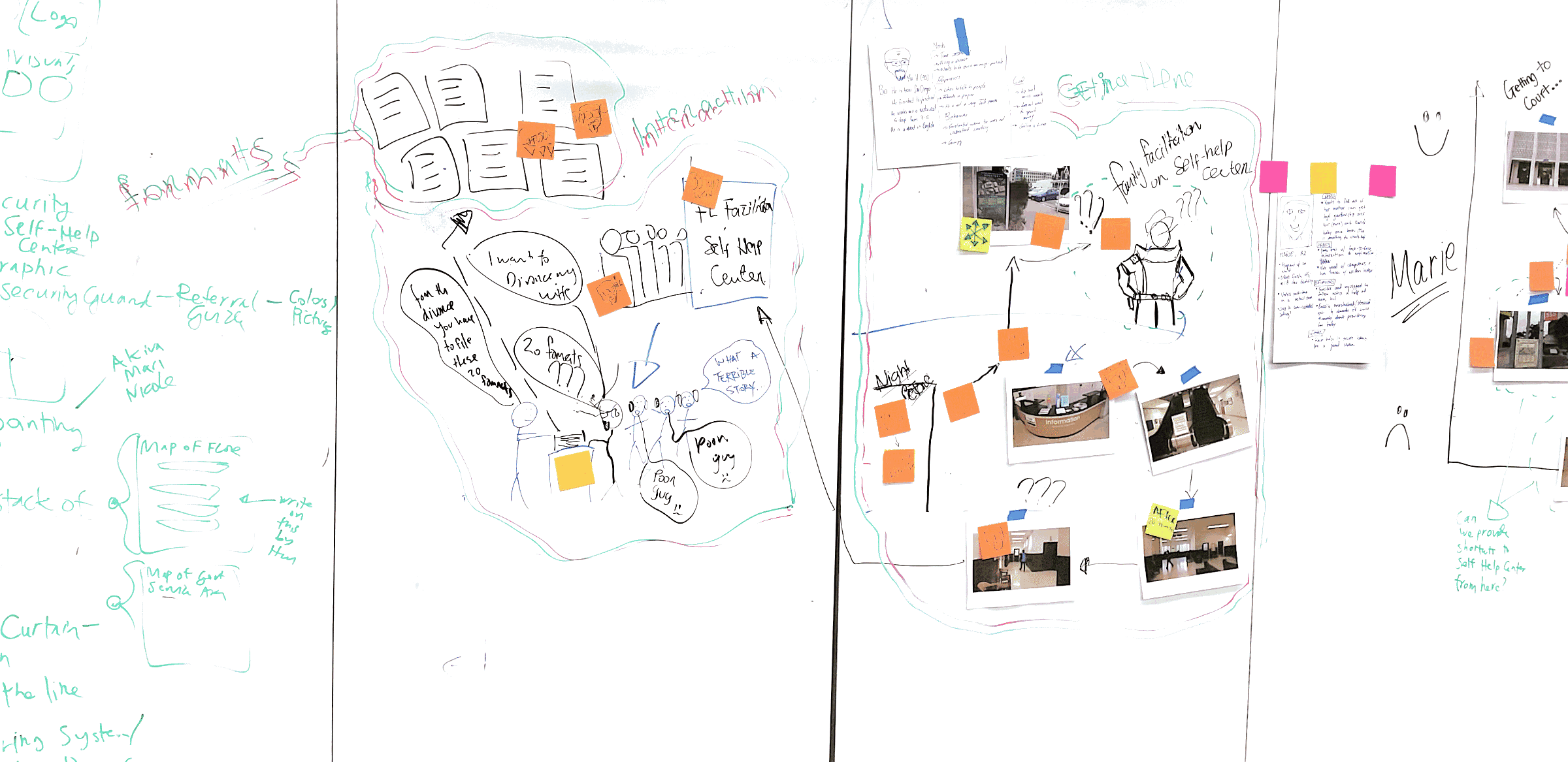 From these conversations, our team focused on a few questions to guide our research at the court. We would focus on how to improve the welcome and orientation experiences of people who come to the court building in order to find help for their family law problems. In addition to this initial stage of engagement, we would also consider the experience of understanding the legal process and trying to follow it.