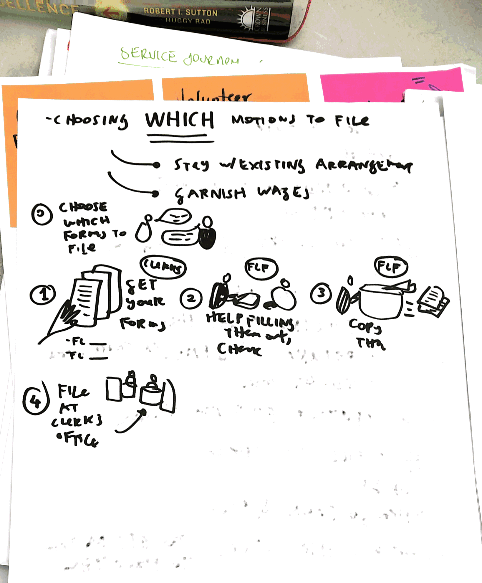 From these conversations, our team focused on a few questions to guide our research at the court. We would focus on how to improve the welcome and orientation experiences of people who come to the court building in order to find help for their family law problems. In addition to this initial stage of engagement, we would also consider the experience of understanding the legal process and trying to follow it.