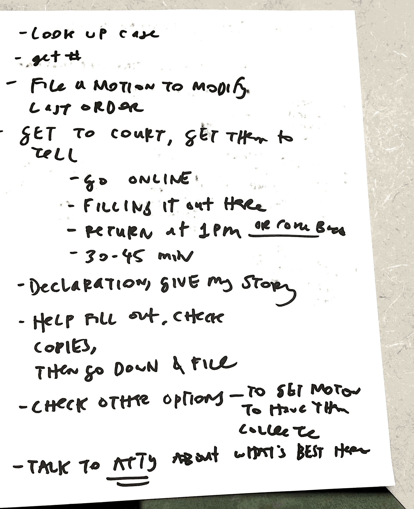 Our class, with its limited time frame, would not explore later steps, like negotiations or mediation, or enforcement of court orders. It would also not address the process of attending hearings and being strategic about them. Rather, we limited ourselves to the initial stages of the person figuring out the court system and using self-help resources to get started on their process.