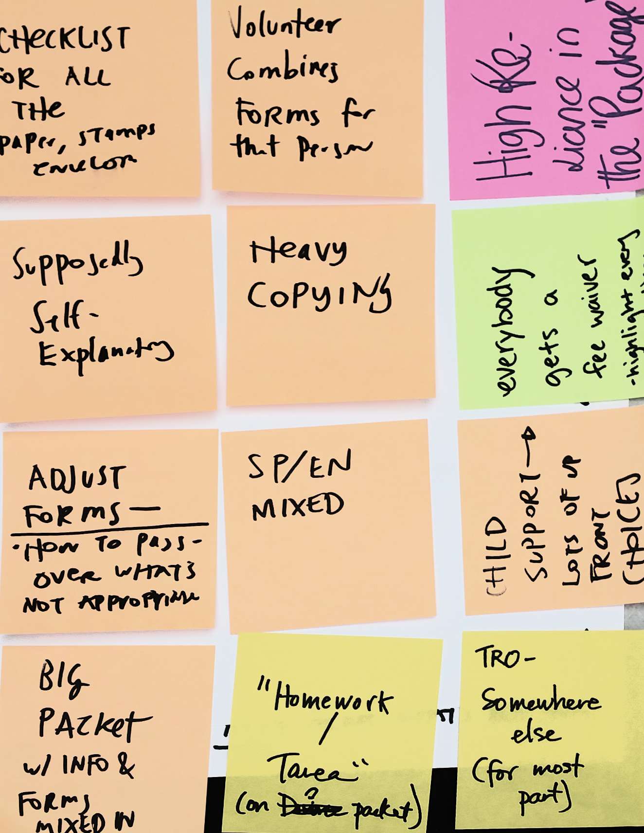 From these conversations, our team focused on a few questions to guide our research at the court. We would focus on how to improve the welcome and orientation experiences of people who come to the court building in order to find help for their family law problems. In addition to this initial stage of engagement, we would also consider the experience of understanding the legal process and trying to follow it.